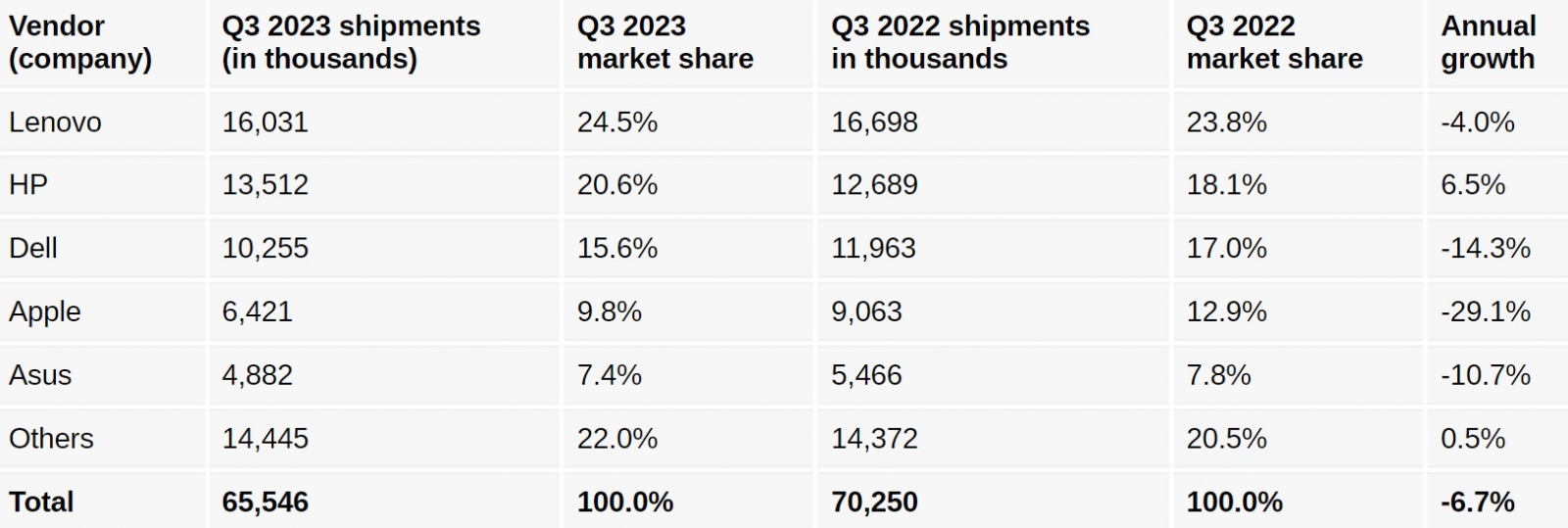 Az éves eladások visszaesése folytatódik, de a különbség már nem annyira jelentős. 6,7%-kal kevesebb eladást regisztráltak az előző évhez képest. 2023 július-szeptemberében 65,5 millió számítógépet és laptopot adtak el, és a Lenovo továbbra is vezet ezen a területen. A cég 4%-os eladási visszaesést regisztrált, ezzel szemben a második helyen álló HP 6,5%-os növekedést ért el az előző évihez képest.