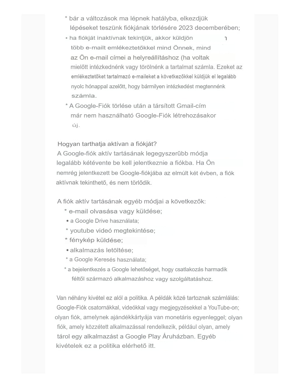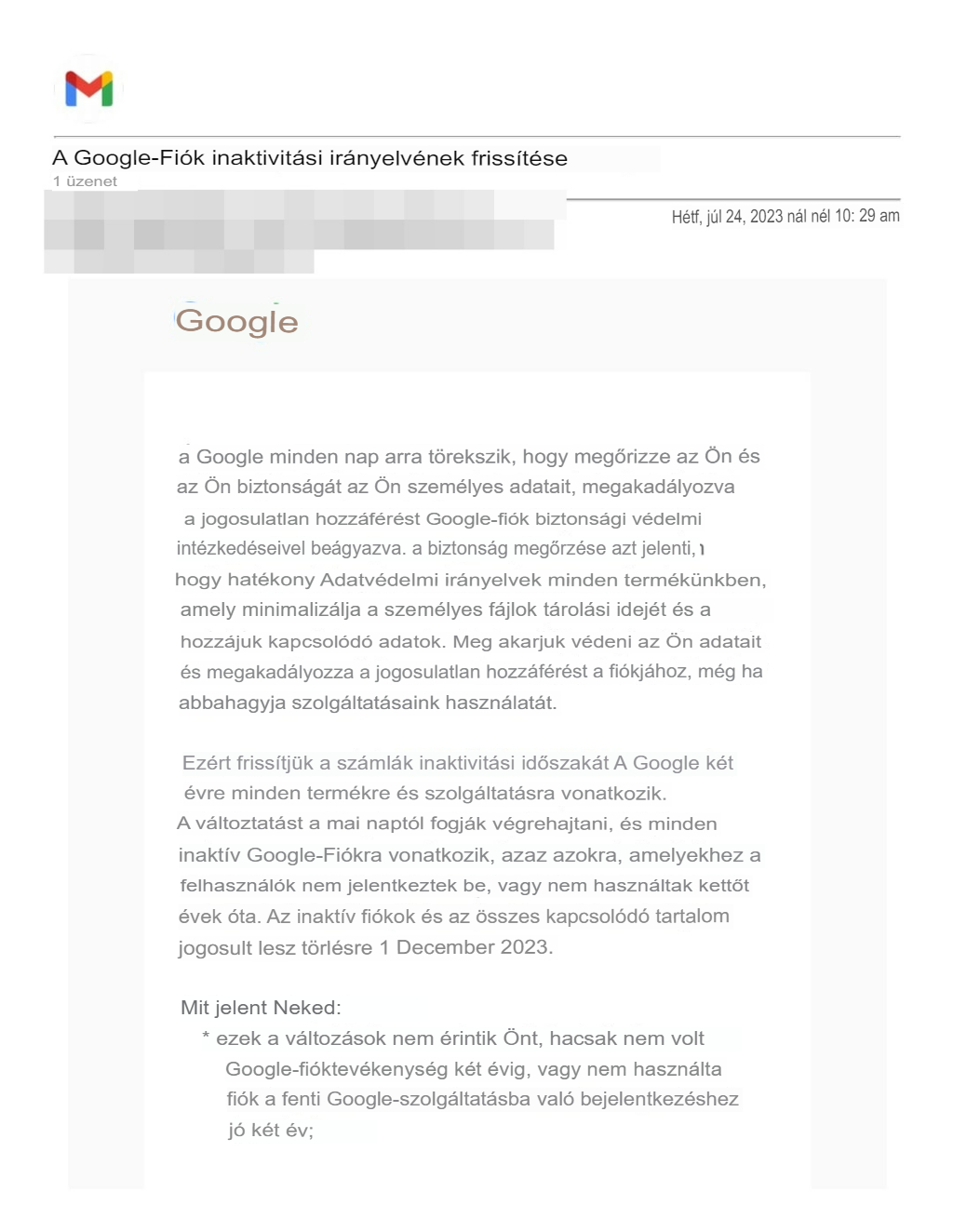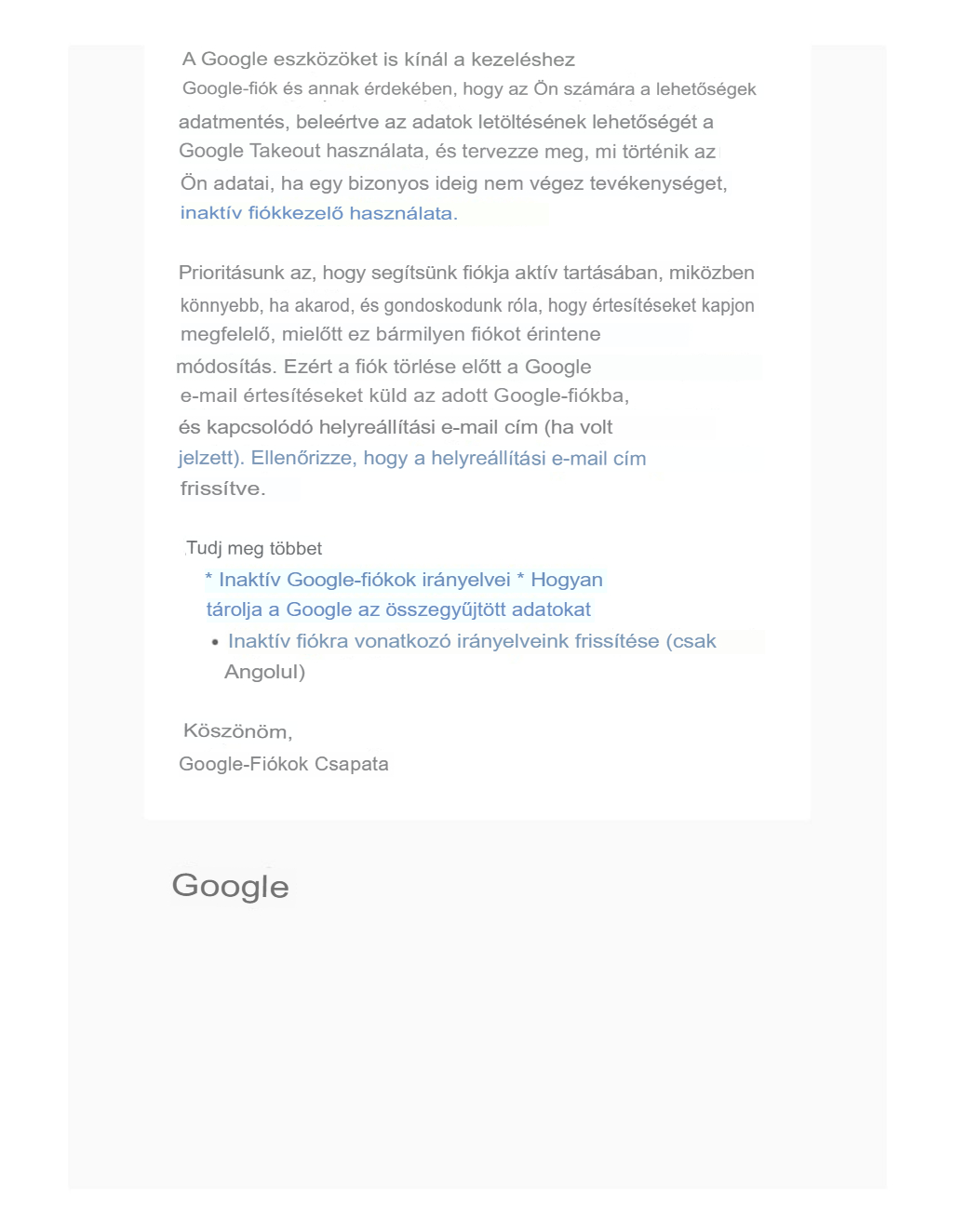 A fenti galériában megtalálod a Google által az inaktívnak minősített fiókokhoz küldött e-mailt.