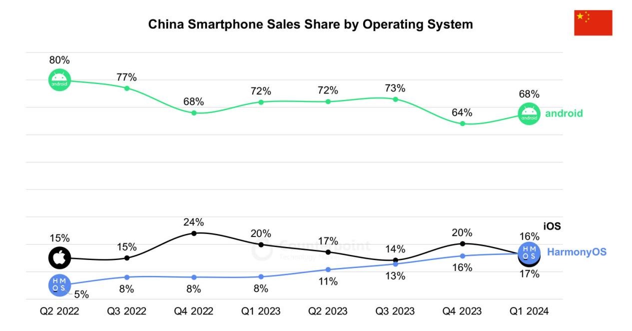 A Counterpoint Research adatai szerint a HarmonyOS piaci részesedése Kínában jelentősen nőtt, 2023 első negyedévének 8%-áról 2024 első negyedévére 17%-ra. Ez a lenyűgöző növekedés lehetővé tette a Huawei által fejlesztett operációs rendszer számára, hogy megelőzze az iOS-t, így az Android után a második legnépszerűbb operációs rendszer lett Kínában. A korábban tárgyalt HarmonyOS NEXT megjelenése tovább erősítette ezt a pozíciót.