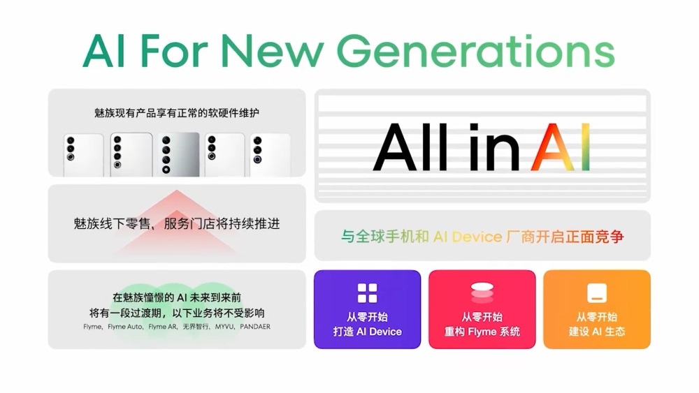 A Meizu döntése, hogy kilép a mobiltelefon-üzletágból, összhangban áll a cég történetével, amely korábban már felhagyott egy sikeres termékvonalával, hogy új területeken innováljon. Most, két év előkészület után, amely a csapatépítést, erőforrás-kihelyezést és terméktervezést foglalta magában, a vállalat készen áll a teljes körű MI területén való elköteleződésre. Terveik között szerepel egy az MI korára szabott új mobil operációs rendszer bevezetése 2024-ben, valamint az év folyamán az első MI hardvertermék bemutatása.