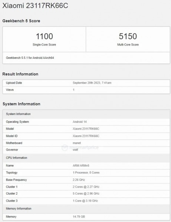 Az új telefon Android 14 rendszeren fut és 16 GB RAM segíti a működését. Ami igazán érdekes, hogy a lapka nyolc magból áll, és ezek 1+2+5 felállásban dolgoznak. Egyikük pedig 3.19 GHz-en pörög. Mindez arra utal, hogy valóban a Snapdragon 8 Gen 3 lehet benne, amit a Qualcomm csak a következő hónapban tervez bemutatni, egy Hawaii-on tartott eseményen. A telefon egymagos teszten 1100, többmagos teszten pedig 5150 pontot ért el a GeekBench platformon.