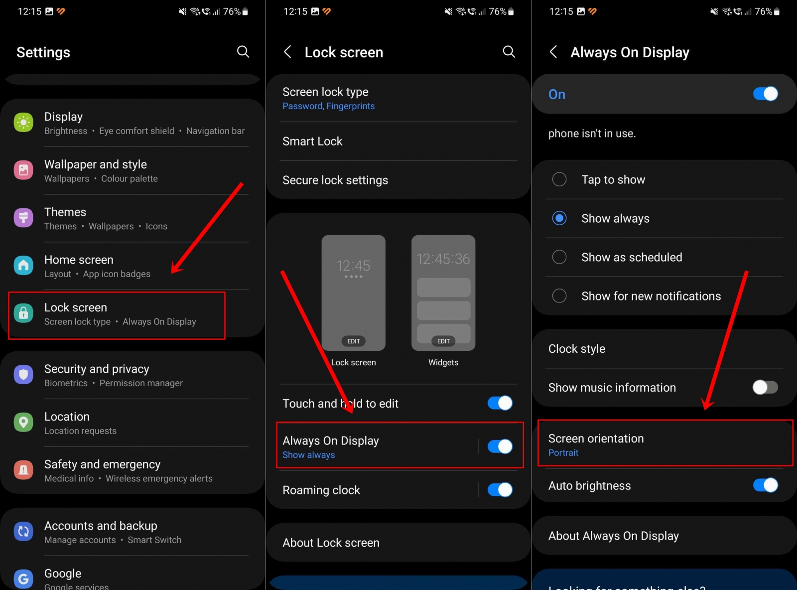 A Samsung okostelefonoknál az AoD módot horizontális nézetben lehet aktiválni. Az aktiváláshoz navigálnunk kell a Beállítások menüpontba, majd a Képernyőzárlat -> Always On Display -> Képernyő Orientáció (Screen Orientation) menüpontokba, ahol választhatjuk a „Landscape / Orizontal” beállítást. Így láthatjuk az órát, az érkező értesítéseket, és a zenelejátszót, ha Spotify vagy YouTube alkalmazáson keresztül hallgatunk zenét.