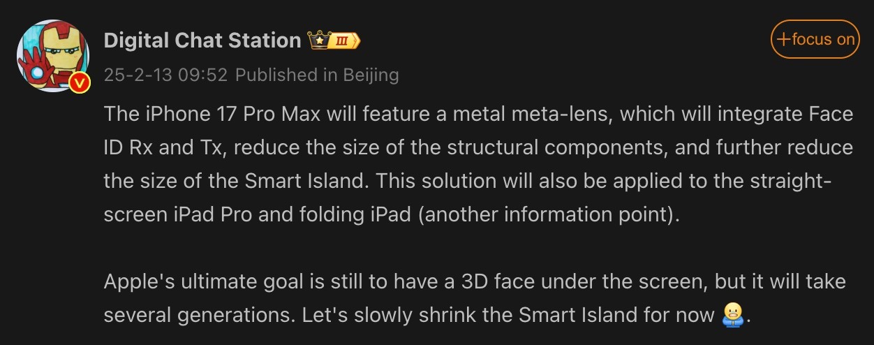 Bár egyes források megerősítik, hogy az iPhone 17 Pro Max kisebb Dynamic Island-et kap, az elemzők véleménye megoszlik. Ming-Chi Kuo szerint az Apple nem fogja csökkenteni a méretet, míg Jeff Pu ezzel ellentétes információkat közölt, mondván, hogy a metalens bevezetése elkerülhetetlenül csökkenti a Face ID modul méretét.