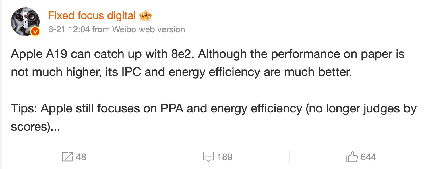 A Weibo egyik ismert szivárogtatója, Fixed Focus Digital szerint az Apple ahelyett, hogy a Geekbench csúcsait hajszolná, inkább a valódi használati időt optimalizálja. Az A19 Pro az új generációs, TSMC által gyártott N3P 3 nm-es gyártástechnológián készül, és 4000+ egy- és 10000+ többmagos Geekbench pontszámra lő. Ez előrelépés az A18 Pro-hoz képest (3539 / 8772), de várhatóan még így is alulmarad majd a Snapdragon 8 Elite 2-vel szemben, amely a Galaxy S25 szériában debütál.