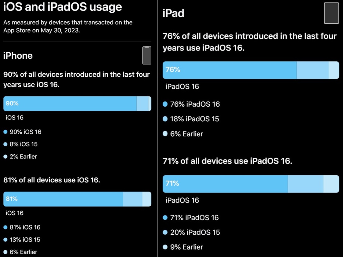 A táblagépek felé fordulva megállapíthatjuk, hogy az iPadOS 16 fut a cég összes iPad-jének 71 százalékán, míg 20 százalékuk még mindig az iPadOS 15-öt használja. Ha kizárólag az utóbbi négy évben piacra dobott iPad-ekre vonatkozóan vizsgálódunk, kiderül, hogy a legújabb rendszerverzió 76 százalékon fut.