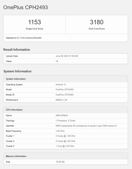 A OnePlus Nord 3 modellszáma CPH2493, alaplapját pedig „k6983v1_64” kódjelzéssel ismerhetjük. A listázás szerint a telefon nyolcmagos lapka kapott, melynek egyik magja 3,05 GHz-en fut. A korábbi híreknek megfelelően a lapka valószínűleg a MediaTek Dimensity 9000 lesz.