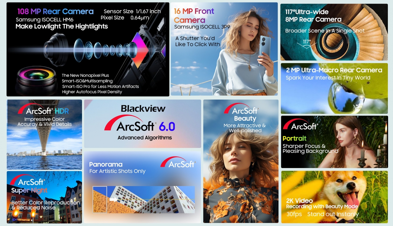 A 16 megapixeles, Samsung szenzorral rendelkező előlapi kamera kiváló selfik készítésére alkalmas. A Blackview ArcSoft 6.0 algoritmust is beépített, amely javítja a HDR és a Super Night képminőséget.