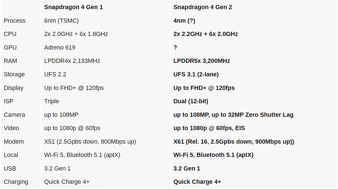 A Snapdragon 4 Gen 2 egy nyolcmagos lapka, amelynek két magja 2,2 GHz-es órajellel rendelkezik a teljesítményért, a további hat mag pedig 2 GHz-es órajellel a energiahatékonyságért felel. A Qualcomm szerint a lapka körülbelül 10%-kal növeli a teljesítményt az elődmodellhez (Snapdragon 4 Gen 1) képest. A grafikus lapka adatairól a vállalat még nem adott bővebb információt, de megtudtuk, hogy ez a lapka támogatja a Full HD+ felbontású kijelzőket és akár 120 Hz-es frissítési rátát is.