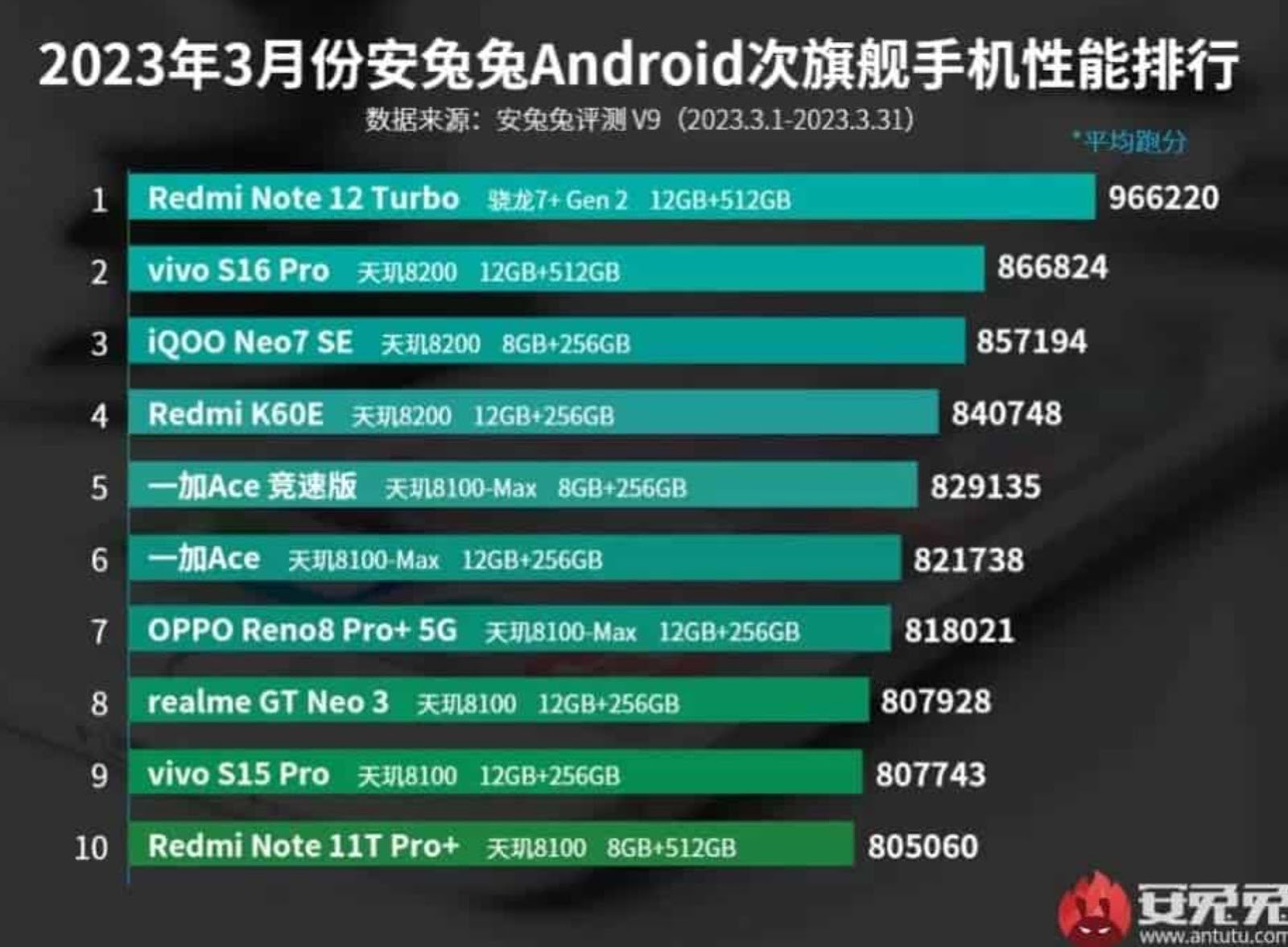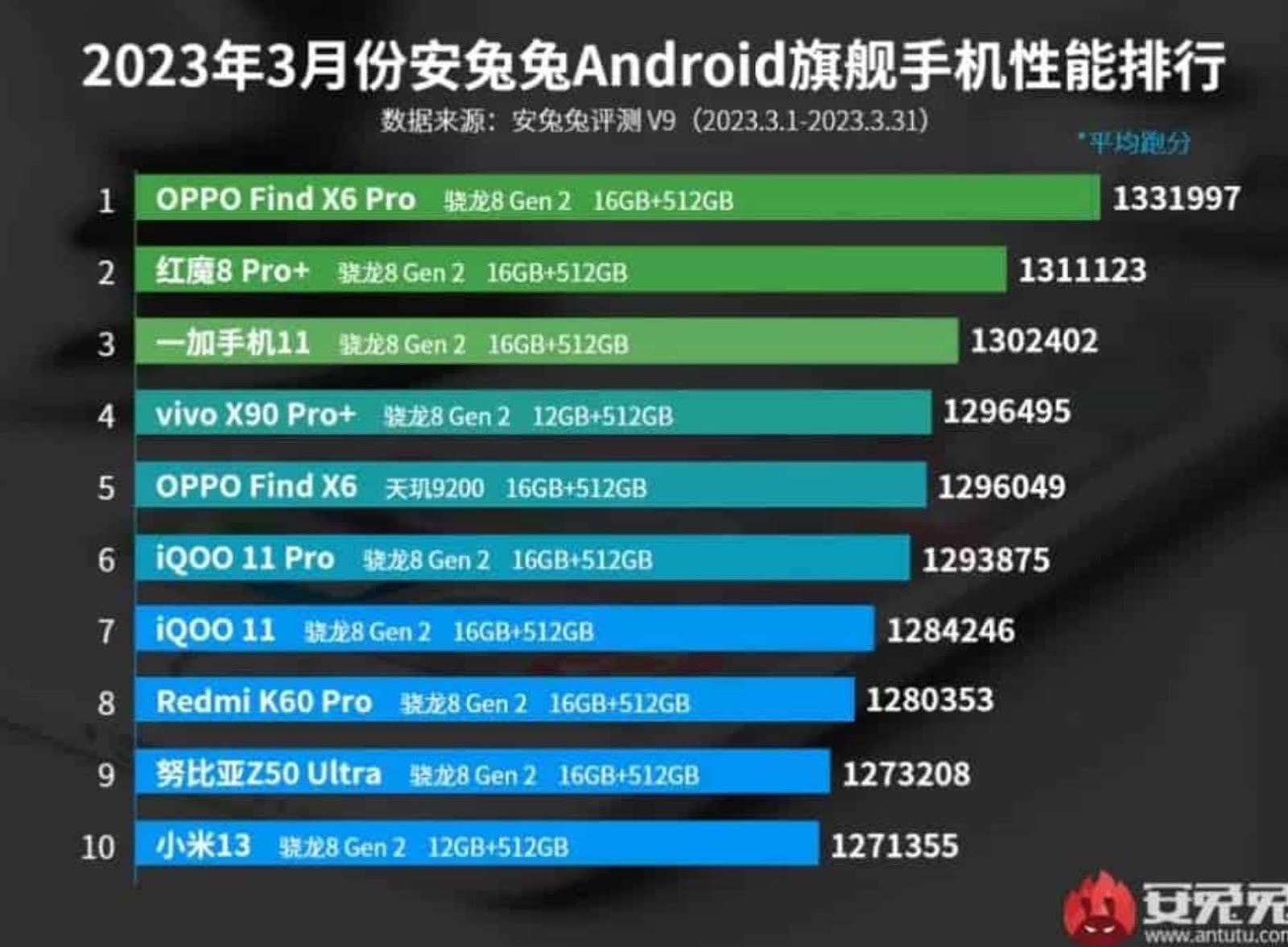 Januárban a Nubia Red Magic 8 Pro+ vezette a globális listát, a Vivo X90 Pro+ pedig a második helyen állt. Március végén azonban megjelent az OPPO Find X6 Pro, amely átvette a vezetést a Snapdragon 8 Gen 2 processzorral, 16 GB RAM-mal és 512 GB tárhellyel. A második helyen a Nubia Red Magic 8 Pro+ található, míg a harmadik helyen a OnePlus 11 áll, mindkettő ugyanezzel a processzorral. Az első 10 csúcstelefon közül 9 modell rendelkezik a fent említett processzorral, az egyetlen kivétel az OPPO Find X6, amely MediaTek Dimensity 9200 processzorral érkezik. Márciusban még egy új modell jelent meg, a ZTE Nubia Z50 Ultra.