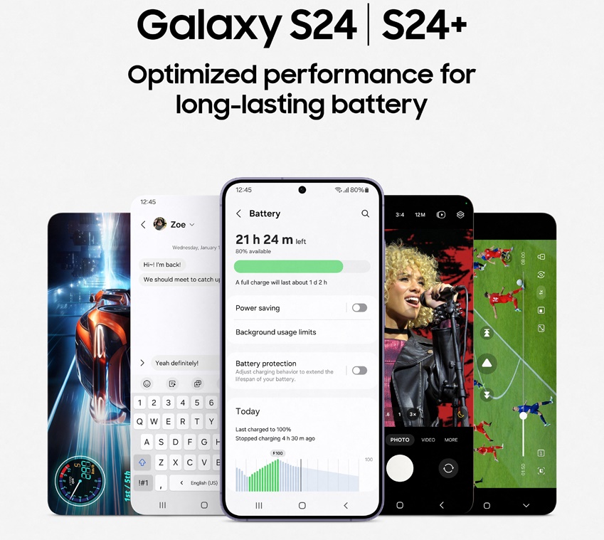A Galaxy S24 és S24 Plus modellek esetében újítás a Samsung által választott CPU. Az Exynos 2400 egy 4nm-es folyamaton gyártott 10-magos lapka, amelyben 3.2GHz, 2.9GHz, 2.6GHz, és 1.95GHz-es magok találhatók az energiahatékonyság érdekében. Egy új AMD RDNA3 alapú Xclipse 940 GPU is helyet kapott a rendszerben.
