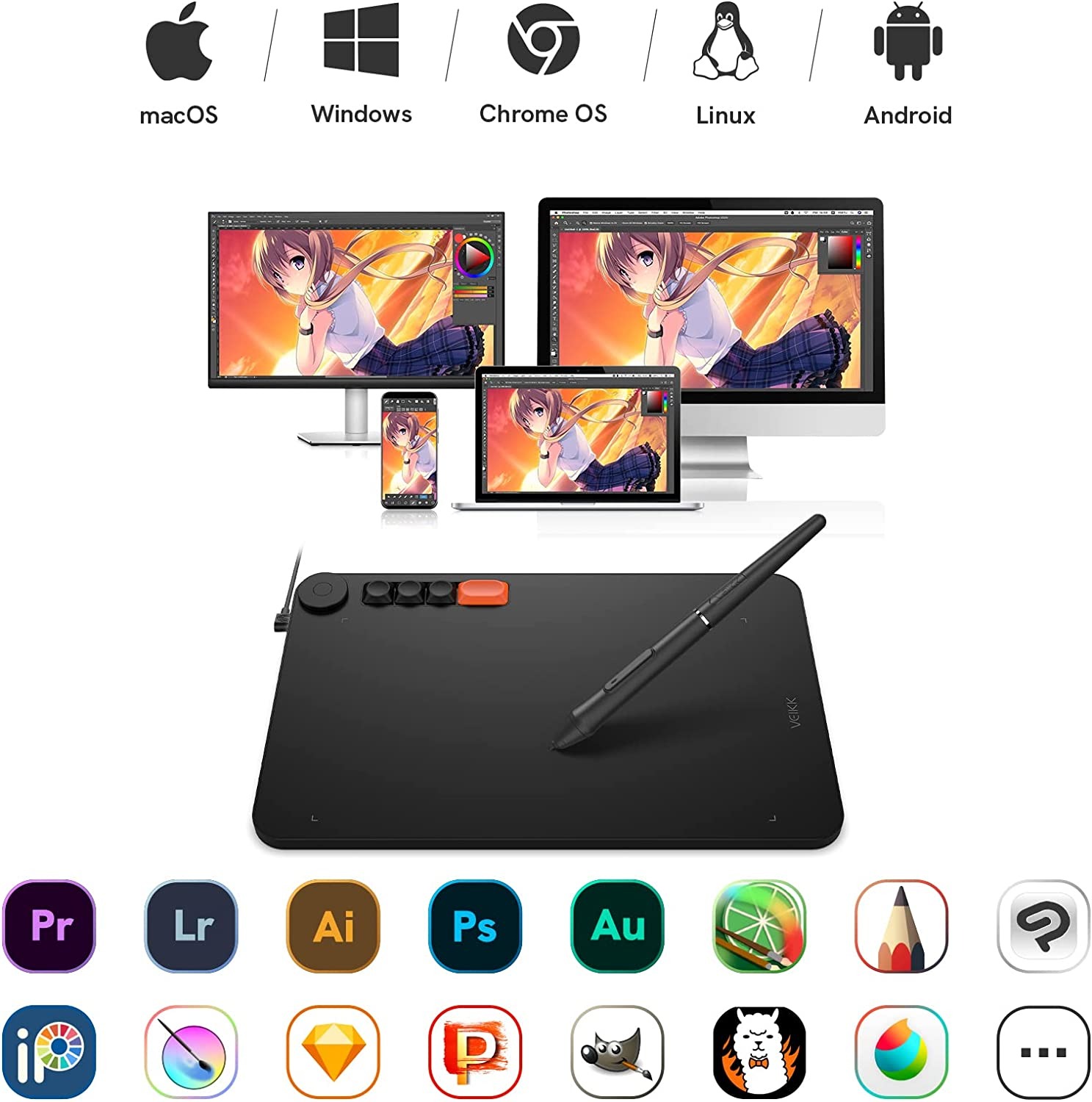 A VEIKK Voila L használható olyan programokban, mint az Adobe Photoshop, Lightroom, Illustrator PC-n vagy Mac-en, valamint az Autodesk Androidon vagy a GIMP Linuxon. A csomagban tartalék hegyeket is kap a ceruzához, ujjatlan kesztyűt, és a mechanikus gombokat könnyedén lecserélheted, ha szeretnéd testre szabni a keycaps-eket.