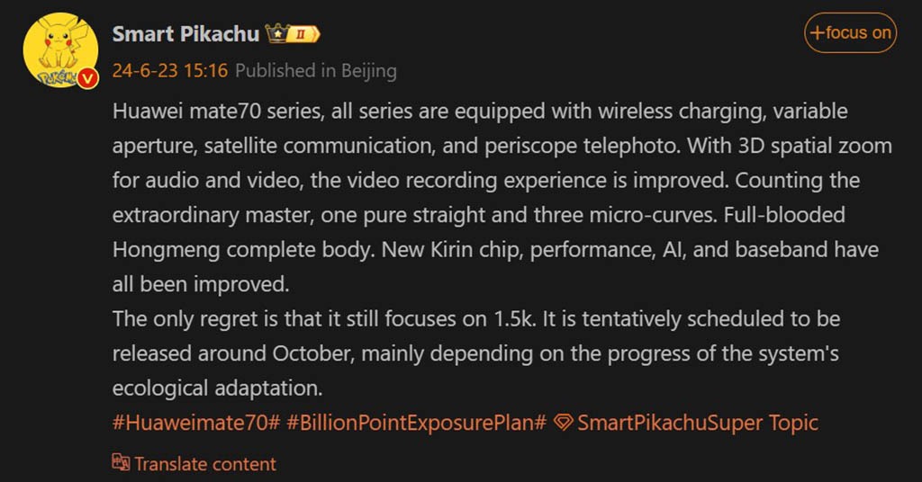 Nemrégiben az is kiderült, hogy a Huawei Mate X6 is készülőben van, bár ez nem egy hagyományos összehajtható eszköz lesz, hanem egy „háromszoros hajlítható” modell. A Nova sorozat is kap egy saját flip típusú hajlítható telefont. Közben a Weibo-n megjelent @SmartPikachu szerint a következő Mate sorozat komoly frissítést hozhat az elődökhöz képest. Támogatni fogja az optimalizált vezeték nélküli töltést és egy új típusú változtatható nyílást.