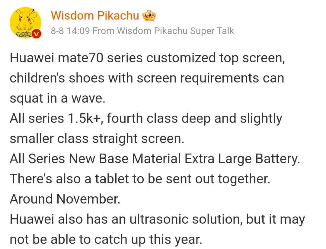 Richard Yu, a Huawei ügyvezető igazgatója egy fejlesztői konferencián elárulta, hogy a Mate 70 2024 negyedik negyedévében jelenik meg. Egy Weibo-nak köszönhetően további specifikációkat is megtudtunk a Mate 70-ről. A Wisdom Pikachu nevű szivárogtató szerint a sorozat összes változata testreszabott, 1.5K felbontású paneleket kap, amelyek csúcstechnológiás funkciókkal rendelkeznek.