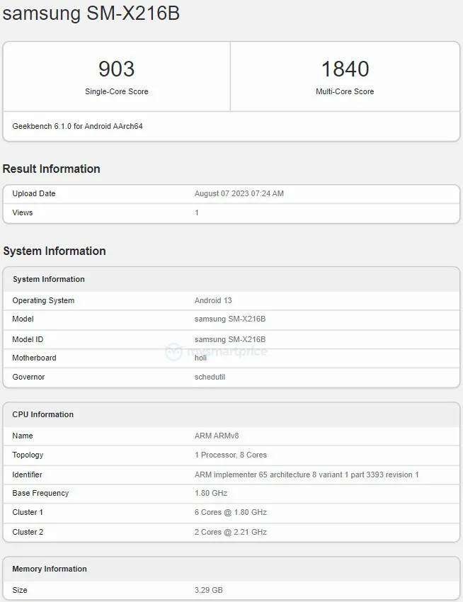 A GeekBench 6 listázásában a tabletta 903 pontot ért el egyetlen magon, illetve 1840 pontot több magon. A tablettában Snapdragon 695 lapka, Adreno 619 GPU, 4 GB RAM és Android 13 operációs rendszer található.