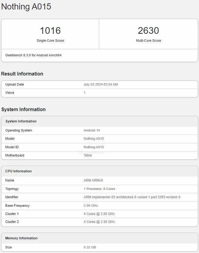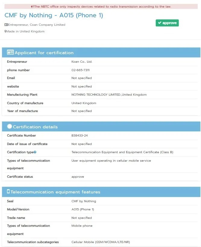 Az NBTC tanúsítvány szerint a CMF Phone (1) modellje az A015 számot viseli, és 5G csatlakozással rendelkezik. A GeekBench adatbázisban a készülék MediaTek Dimensity 7300 lapkával tűnt fel, amelyet egy Mali-G615 MC2 GPU és 6 GB RAM támogat. Az operációs rendszer Android 14 lesz. A GeekBench 6 tesztben a telefon 1016 pontot ért el single-core, és 2630 pontot multi-core kategóriában, ami közepes teljesítményt jelez.