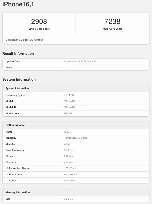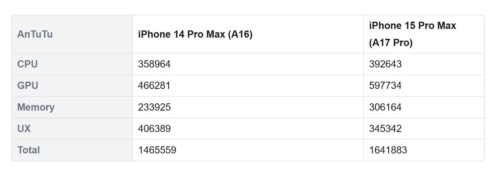 Az A17 Pro lapka a TSMC 3 nm-es technológiájára épül. Meg kell említenünk, hogy az iPhone 15 Pro és 15 Pro Max GeekBench eredményei is már elérhetőek az interneten, ahogyan a GFXBench adatai is. Az AnTuTu teszten az új modell megelőzi az előző generációs iPhone 14 Pro Maxot a CPU, GPU, Memória és UX kategóriákban.