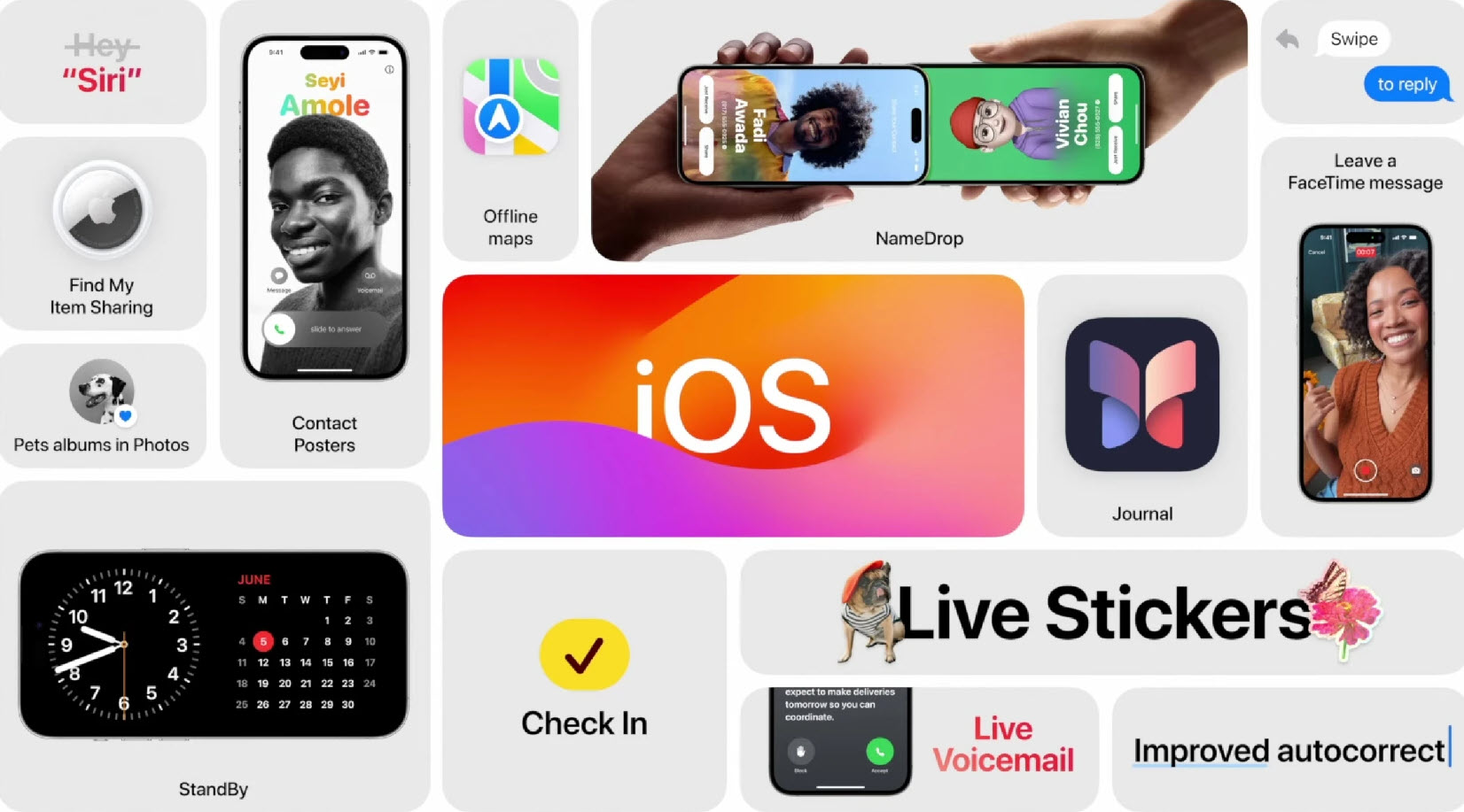 Az iOS 17 többek között további testreszabási lehetőségeket kínál a zárolt képernyőn, fejlesztéseket hoz az iMessage és a FaceTime terén, valamint újításokat hoz a Health (egészség) alkalmazásban (például a mentális egészség támogatása). Új Standby mód is megjelenik, amely az iPhone-t okosórává/Smart Display-jévé alakítja, nagy méretű órát, widgeteket, Homekit-et és más alapfunkciókat jelenít meg.
