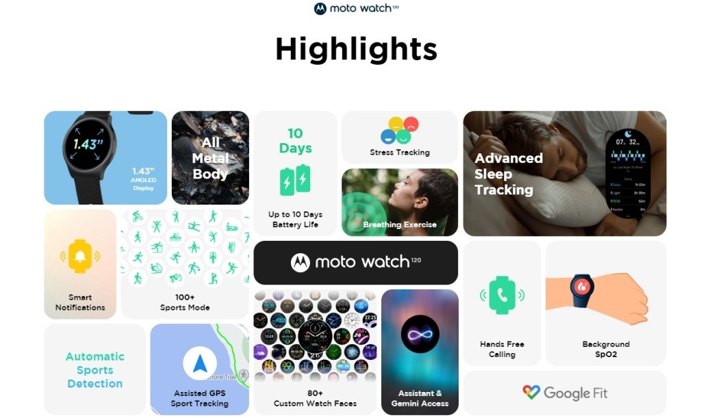 Az okosóra különlegességei közé tartozik a fejlett egészségügyi és fitneszkövetés. A beépített szenzorok, mint az accelerometer, a szívritmusmérő (HRM) és az SpO2 érzékelő, lehetővé teszik a felhasználók számára, hogy nyomon kövessék az alvásukat, stressz-szintjüket, valamint több mint 100 sportmód közül válasszanak. A Moto Watch 120 több mint 80 testreszabható óraszámlapot kínál, így minden felhasználó saját ízlésére szabhatja az eszköz megjelenését.