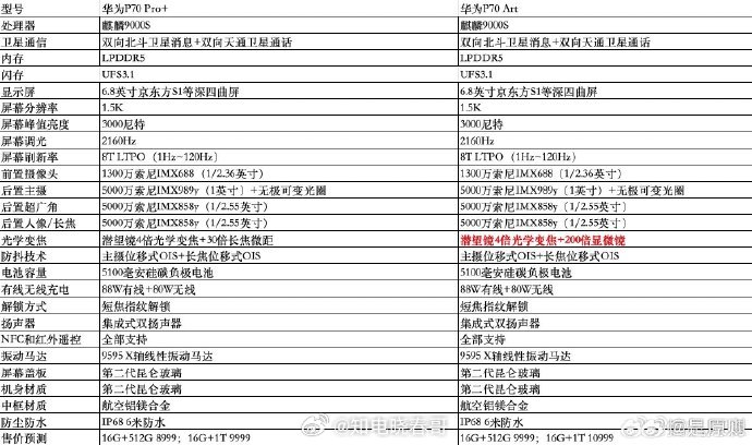A P70 és P70 Pro modellek egy háromszög alakú kameramodullal érkeznek, míg az Art változat egy szabálytalan formájú modult kap. Az Art model várhatóan a sorozat legerősebb készüléke lesz, amely egy új generációs Kirin processzorral rendelkezik, és a GeekBench multi-core tesztjén 4589 pontot ért el.