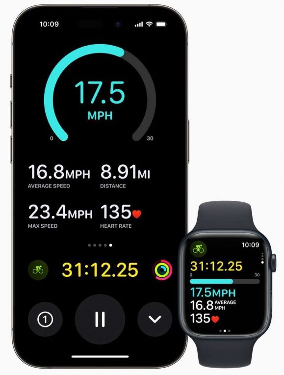 Az Apple továbbá új kerékpározási funkciókat is bevezet a watchOS 10 frissítéssel, beleértve a pedálsebesség, emelkedés, pulzus, időtartam és távolság átfogó képét. Kapcsolódhatunk Bluetooth kerékpár számítógépekhez is. További újdonságok között van az Egészség alkalmazás Vision szekciója, ahol az óra méri, mennyi időt töltesz a napfényben az ambientális fényérzékelő segítségével. Mérni fogja azt is, milyen távolságra nézel a telefonodra, és ha kevesebb mint 30 cm-re vagy tőle, az óra értesítést küld.